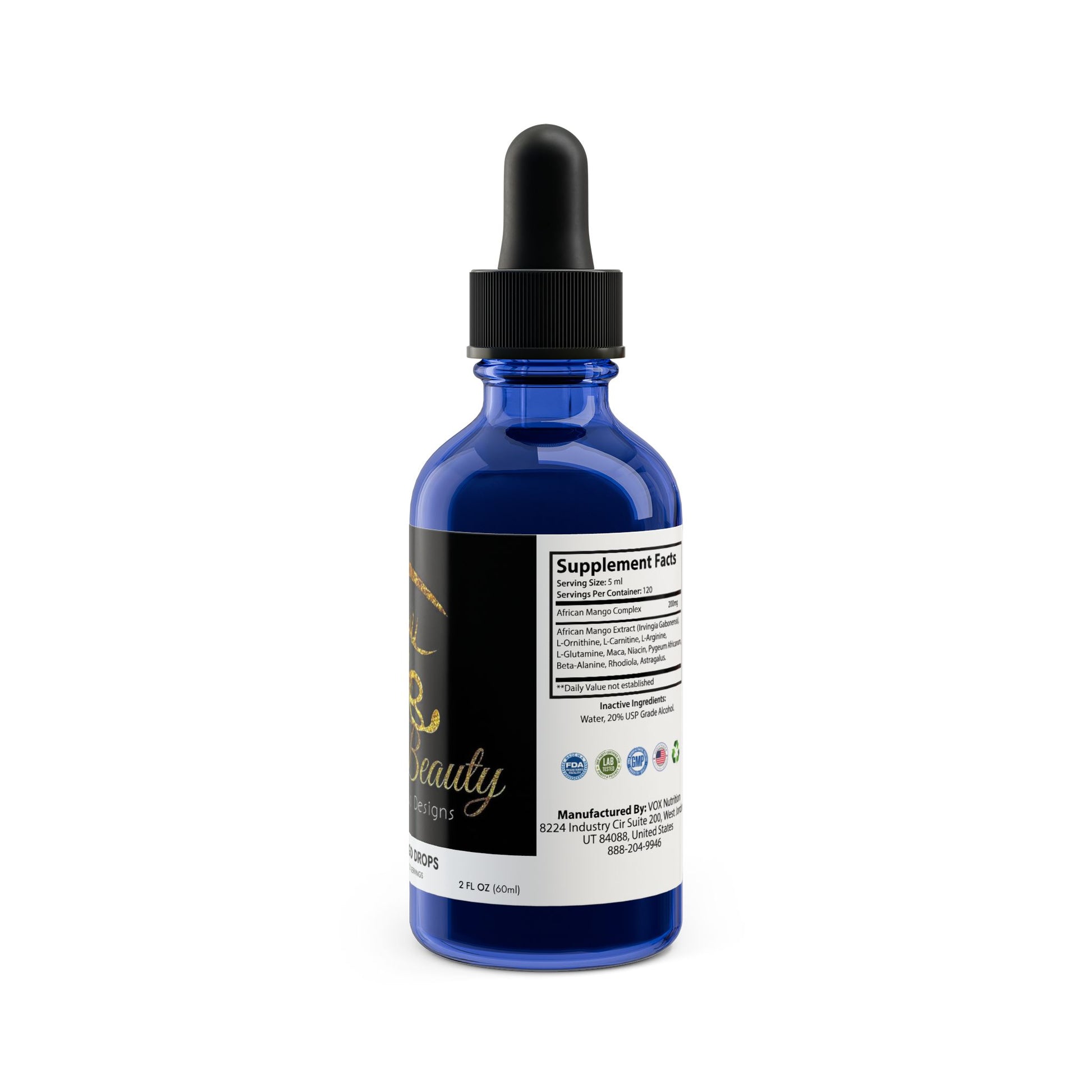 Ingredients: African Mango Complex, African Mango Extract (Irvingia Gabonensis), L-Ornithine, L-Carnitine, L-Arginine, L-Glutamine, Maca, Niacin, Pygeum Africanum, Beta-Alanine, Rhodiola, Astragalus. Inactive Ingredients: Water, 20% USP Grade Alcohol